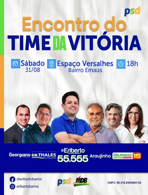 O vereador e atual presidente da Câmara Municipal de Picos, Dr. Eriberto Barros (PSD), candidato a reeleição, irá reunir no próximo sábado, 31 de agosto, às 18h no Espaço Versalhes, bairro Emaús, familiares, lideranças políticas locais e estaduais além de amigos e simpatizantes no evento que tem como tema “Encontro da Vitória”, que visa amplo diálogo com a população além da apresentação de propostas e fortalecimento da campanha eleitoral.